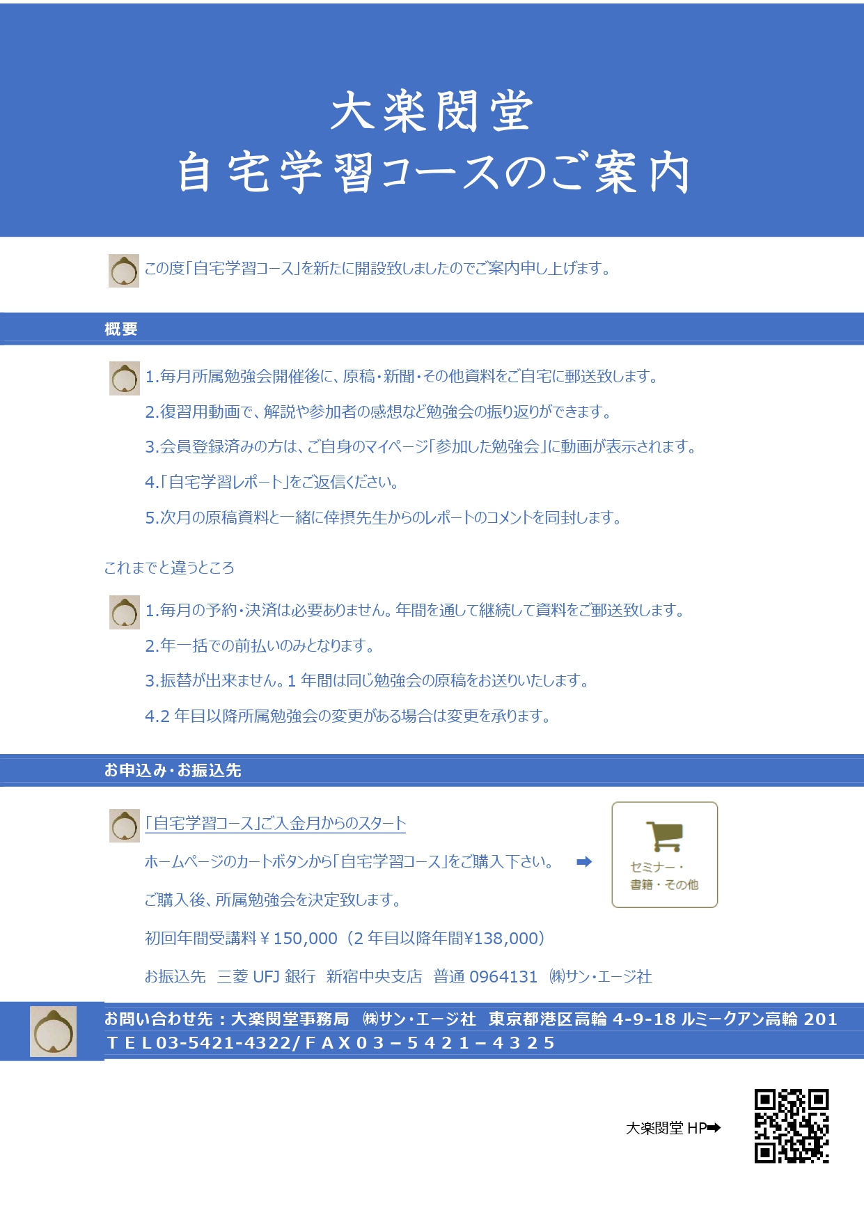 定例勉強会へのご参加が難しい方、Zoomが苦手な方、自宅でじっくり学びたい方などそんな皆様に「自宅学習コース」を新設致しました【内容】原稿資料を毎月ご自宅にお届け ⇩資料を見てご自宅で書写 ⇩勉強会動画で解説を視聴 ⇩自宅学習レポートの提出 ⇩1年後門下生カード発行●お申込みは「セミナー・書籍・その他」より「(初回)自宅学習コース」をカートに入れてご購入下さい。●お申し込み後、詳しいご案内をメールでお知らせいたします。